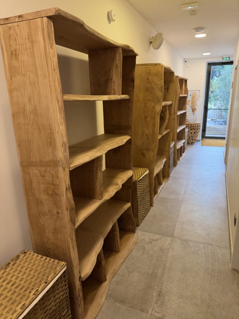 Dans l’univers feutré d’un centre de bien-être ou d’un SPA, chaque détail compte pour créer une atmosphère de sérénité absolue. Notre étagère en chêne massif réalisée sur mesure n’est pas qu’un simple meuble de rangement ; c’est une pièce maîtresse qui allie la noblesse du bois brut à l’exigence fonctionnelle des environnements humides et luxueux.