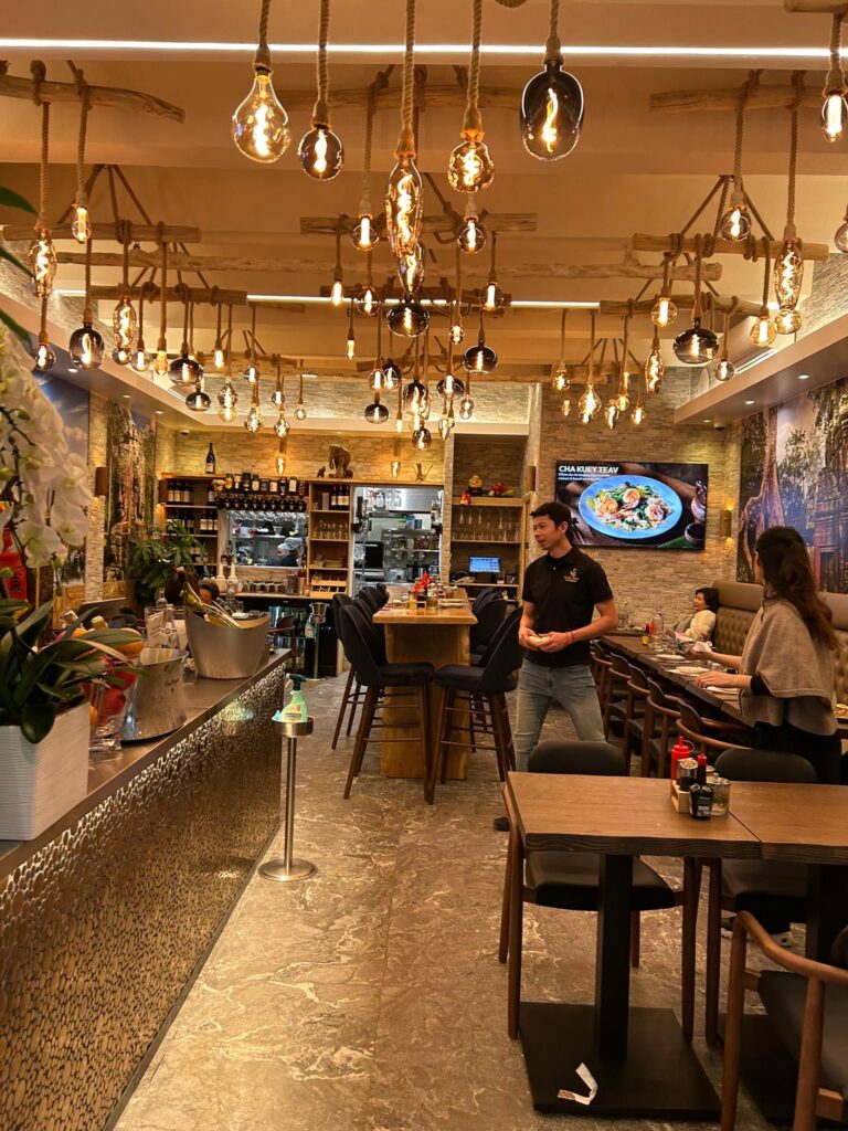 - Mobilier artisanal en chêne brut pour restaurant : tables hautes & comptoir